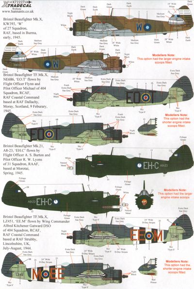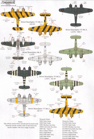 Xtradecal - 1/72 Bristol Beaufighter Mk.X X72227 Bristol Beaufighter Mk.X, TF Mk.X, Mk.21, TT Mk.21 (10) Mk.X KW393/W 27 Sqn Burma 1945, LZ293 RAF Coastal Command 1944, TF Mk.X NE686 EO-T 404 Sqn RCAF Flt/Off Flynn/ P/O Michael RAF Coastal Com RAF Dallachy 1945, LZ451 EE-M 404 Sqn RCAF Wg/Co Alfred Kitchener Gatward DSO D-Day stripes RAF Strubby 1945, NE425 2-G 404 Sqn RCAF RAF Davidstow Moor, Cornwall 1945, LZ293 MB-T 236 Sqn RAF Coastal Command RAF North Coates, Lincs 1944, Mk.21 A8-23 EH-C 31 Sqn RAAF Flt/Off /P/O Lyons Morotai 1945, A8-112 SK-L 93 Sqn RAAF Morotai Island, Borneo 1945 TT Mk.21 A8-265 30 (TT) Sqn Air Trials Unit RAAF Woomera 1957, A8-265 30(TT) Sqn RAAF Woomera 1948,