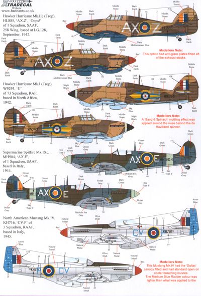 Xtradecal - 1/72 Fighters Over Africa and the Mediterranean Pt.1 Hawker Hurricane Mk.I Tropical version W9293/U 75 Sqn RAF 1942, Hurricane Mk.IIc (Trop) HL885 AX-Z 'Oops' 1 Sqn SAAF 1942, BP317 AX-N 'B Lucky III' 1 Sqn SAAF 1942, Supermarine Spitfire Mk.Vb (Trop) EF552/Z 7 Sqn SAAF Cyprus 1943, JK792 WR-O 49 Sqn SAAF Italy 1844, Spitfire Mk.Vc(trop) KJ-Z 4 Sqn SAAF Sicily 1943, Spitfire Mk.IXc H904 AX-E 1 Sqn SAAF Italy 1944, SM143 KL-T Major M.V.Wally Brunton DFC 4 Sqn SAAF Italy 1945, North-American P-51B Mustang Mk.III FH244 OK-F 450 Sqn RAAF Italy 1945, P-51D Mustang Mk.IV KH716 CV-P 3 Sqn RAAF Italy 1945, Curtiss P-40N Kittyhawk Mk.IV FX666 CV-V 450 Sqn RAAF Italy 1944.