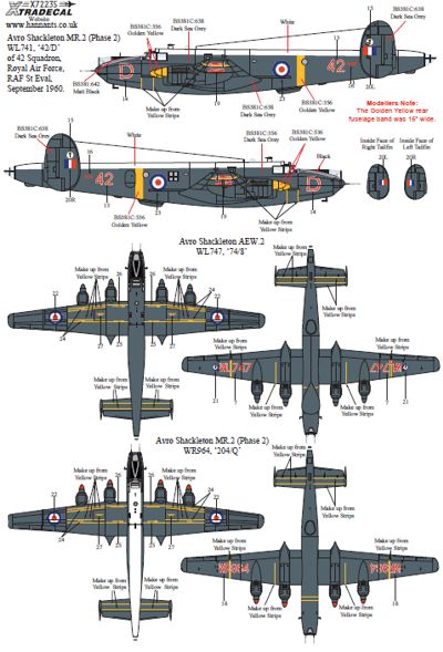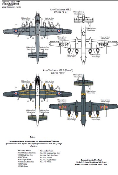 Xtradecal - 1/72 Avro Shackleton MR.2/AEW.2 Pt 1 (4) AEW.2 WL747 47/8 Sqn RAF Lossiemouth 1979 Overall DSG, MR.2 WR964 204/Q 204 Sqn RAF Ballykelly 1953 White/DSG, WG554 A/A 42 Sqn RAF St Eval 1953 MSG/White, WL741 42/D 42 Sqn RAF St Eval 1960 White/DSG, Manufacturer: