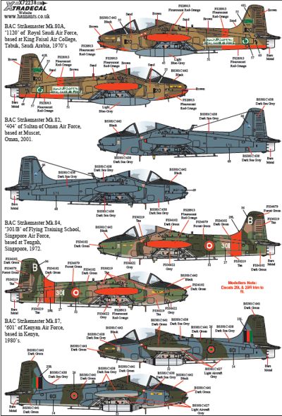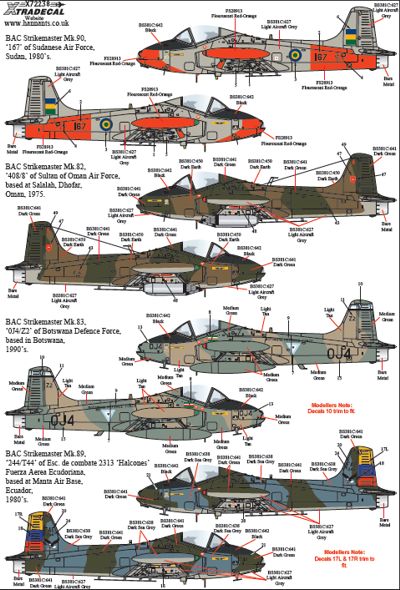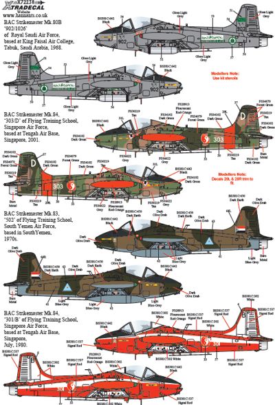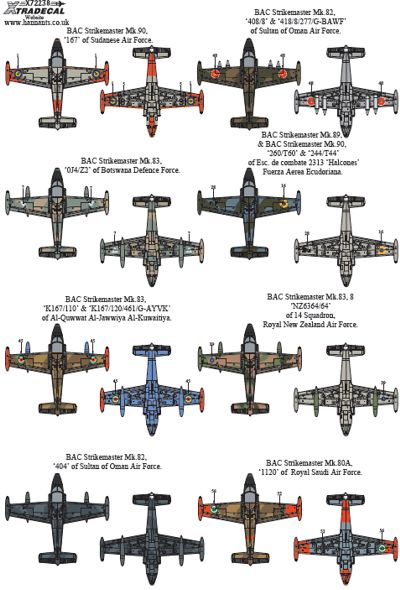 Xtradecal - 1/72 BAC Strikemaster (19) Mk.80 G-AWOS at Farnborough Air Show 1968, Mk.80A 1120 Royal Saudi AF, King Faisal Air College, Saudi Arabia 1970, Mk.80B 902/1026 Royal Saudi AF, King Faisal Air College, Saudi Arabia 1968, Mk.82 418/8 Sultan of Oman AF G-BAWF/277 at Paris Air Show 1973, Mk.82 408/8 Sultan of Oman AF Dhofar 1975, Mk.82 404 Sultan of Oman AF Masirah, Oman 1994, Mk.82 404 Sultan of Oman AF Masirah, Oman 2001, Mk.83 04/Z2 Botswan Defence Force 1990, Mk.83 K167/110 Al-Quwwat, Kuwait 1980, Mk.83 K167/120 Al-Quwwat, Kuwait G-AYVK/461 at Paris Air Show 5/6/1971, Mk.83 NZ6364/64 14 Sn R New Zealand A Ohakea Air Base 1980, Mk.83 502 FTS South Yeman AF Mk.84 301/B FTS Singapore AF, Tengah, Singapore 1972, Mk.84 301/B FTS Singapore AF, Tengah, Singapore 1980, Mk.84 303/D FTS Singapore AF, Tengah, Singapore 2001, Mk.87 601 Kenya AF 1980, Mk.89 244/T44 Esc.de Combate 2313 'Halcones', Fuerza Aerea Ecudoriana 1980, Mk.90 260/T60 Esc.de Combate 2313 'Halcones', Fuerza Aerea Ecudoriana 1990, Mk.90 167 Sudanese AF 1980,