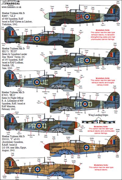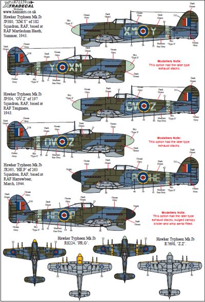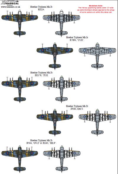 Xtradecal - 1/72 Hawker Typhoon Mk.Ib Car Door (11) R7855 PR-D 609 Sqn F/O R. A. Lallemant RAF Manston, R8697 SA-Z 486 Sqn RAF Kirton in Lindsey 1942 JR365 HE-P 263 Sqn RAF Harrowbeer 1944, R7698 Z-Z 609 Sqn Wng/Co Denis E.Gillan RAF Duxford 1942, DN323/Y 451 (RAAF) Sqn Egypt 1943, DE/Stone/AB, EK273 JE-DT 195 Sqn S/L Don Taylor RAF Ludham 1943, R8224 Royal Aircraft Establishment, Farnborough 1942 with white nose DN334 HF-D 183 Sqn RAF Church Fenton White band on nose for Exercise Spartan, R7694 US-R 56 Sqn RAF Matlaske 1942, EK176 JK-X 1 Sqn RAF Aklington 1943, JP380 XM-Y 182 Sqn RAF Martlesham Heath,
