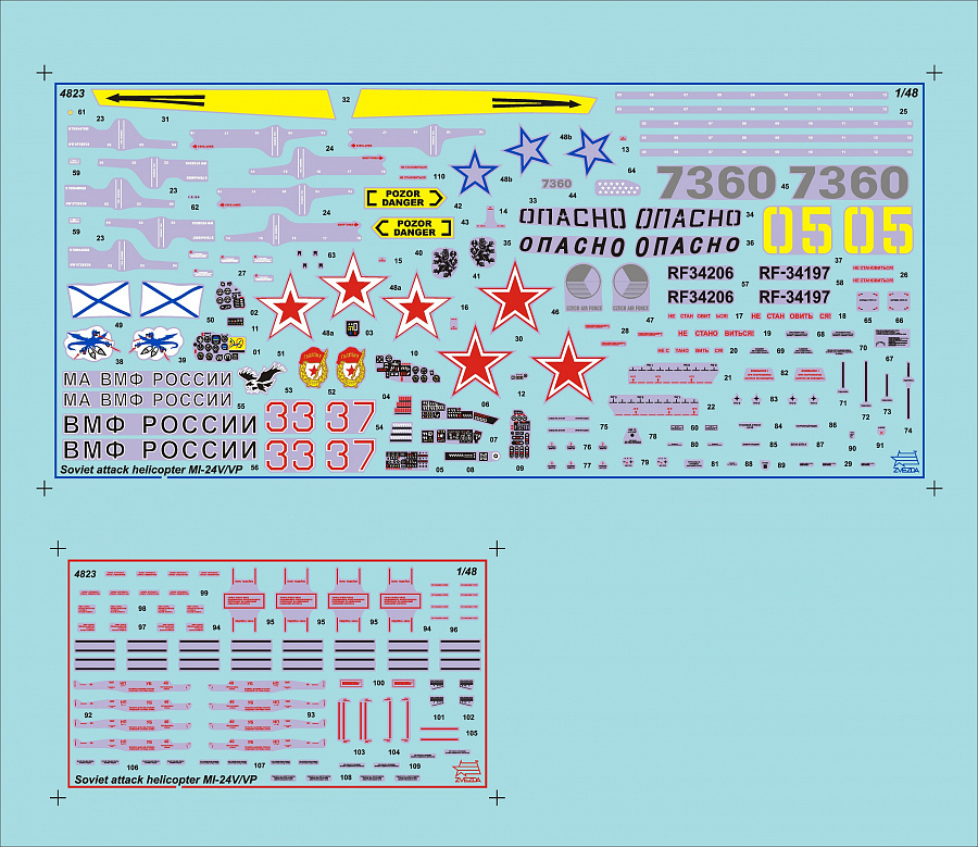The Mi-24 (NATO code Hind) combat helicopter was developed by the Experimental Design Bureau of M.L. Mil in the late 1960s. The MIL-24V as introduced into service in the Soviet Army in 1976 and became the most widespread modification of this helicopter with more than thousand built. The first combat test for Mi-24V was in Afghanistan, where it proved to be a reliable, well-protected machine, effective against enemy troops. In addition to a variety of bombs and missiles carried on six hardpoints, the Mi-24V is equipped with a heavy 12,7mm four barrel YAK-B type machine gun on a rotary turret, mounted under the front cockpit accommodating the gunner / operator. Our kit allows you to built alternatively the Mil Mi-24VP version, armed with the 23mm GSH-23L twin barreled cannon. Both versions of Mi-24 took part in many conflicts and are still in use in Russia and many countries worldwide.