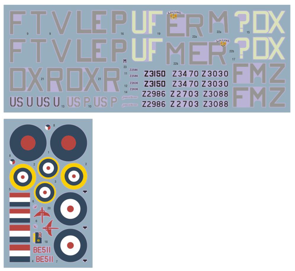DK Decals - 1/48 Hawker Hurricane of Czechoslovak pilots in Raf squadrons, Pt.21. Hurricane Mk.IIB, Z3150, Sgt. J. Pipa, No.43 Sq. RAF2. Hurricane Mk.IIA, Z2586, F/O J. Himr, No.56 Sq. RAF3. Hurricane Mk.IIA, Z2636, Sgt. V. Truhla, No.56 Sq. RAF4. Hurricane Mk.IIB, Z3470, F/O J. Hanus, No.245 Sq. RAF5. Hurricane Mk.IIB, Z2986, P/O J. Bryks, No.242 Sq. RAF6. Hurricane Mk.IIC, Z3088, Sgt. L. Uher, No.257 Sq. RAF7. Hurricane Mk.IIC, Z3030, Sgt. F. Mares, No.601 Sq. RAF8. Hurricane Mk.IIC, BE511, Sgt. V. Bauman, No.245 Sq. RAF9. Hurricane Mk.IIA, Z2703, Sgt. F. Stika, No.258 Sq. Raf