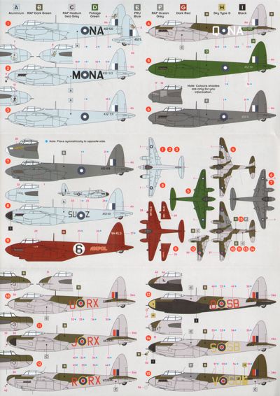 DK Decals - de Havilland 98 Mosquito of Australian pilots in RAAF and RAF (15 camouflage schemes) 1. Mosquito FB.VI, A52-533, No.1 Sq. RAAF, Borneo, 1945 2. Mosquito FB.VI, A52-513, No.1 Sq. RAAF, Borneo, 1945 3. Mosquito FB.VI, A52-531, No.1 Sq. RAAF, Borneo, 1945 4. Mosquito FB.VI, A52-505, No.1 Sq. RAAF, the Philippines, 1945 5. Mosquito FB.40, A52-50, No.5 O.T.U., RAAF, Australia, 1944 6. Mosquito PR.40, A52-6, No.87 Sq. RAAF, Coomalee Creek, 1944 7. Mosquito PR.XVI, A52-619, No.87 Sq. RAAF, Australia, 1945 8. Mosquito FB.40, A52-101, No.87 Sq. RAAF, Australia, 1946 9. Mosquito PR.41, (A52-324) VH-KLG, London/New Zealand Air Race, Cocos Islands, 1953 10. Mosquito Mk.II, DZ269, No.456 Sq. RAF, Middle Wallop, 1943 11. Mosquito Mk.XVII, HK290/G, No.456 Sq. RAF, Ford, 1944 12. Mosquito Mk.XXX, NT264/G, No.456 Sq. RAF, Bradwell Bay, 1945 13. Mosquito FB.VI, HX914, No.464 Sq. RAF, December 1943 14. Mosquito FB.VI, HR352, No.464 Sq. RAF, March 1945 15. Mosquito FB.VI, MM403, No.464 Sq. RAF, Operation Jericho, 18 February 1944