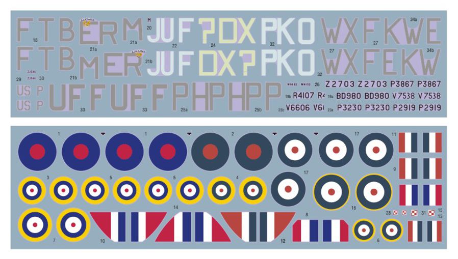 DK Decals - 1/72 Hawker Hurricane of Czechoslovak pilots in Raf squadrons, Pt.31. Hurricane Mk.I R4107, Sgt. J. Pipa, No.43 Sq. RAF2. Hurricane Mk.IIA Z2703, Sgt. F. Stika, No.258 Sq. RAF3. Hurricane Mk.I V6606, Sgt. M. Mansfeld, No.245 Sq. RAF4. Hurricane Mk.IIC BD980, Sgt. V. Bauman, No.245 Sq. RAF5. Hurricane Mk.I W9152, P/O A. Hochmal, No.247 Sq. RAF6. Hurricane Mk.I P3867, Sgt. W. Kosarz, No.302 Sq. RAF7. Hurricane Mk.IIA Z2586, F/O J. Himr, No.56 Sq. RAF8. Hurricane Mk.I V7538, F/Sgt. J. Kaa, No.315 Sq. RAF9. Hurricane Mk.I P3230, P/O R. Rohaek, No.601 Sq. RAF10. Hurricane Mk.I P2919, Sgt. R. Ptaek, No.615 Sq. Raf