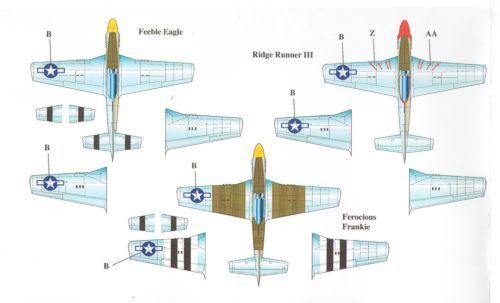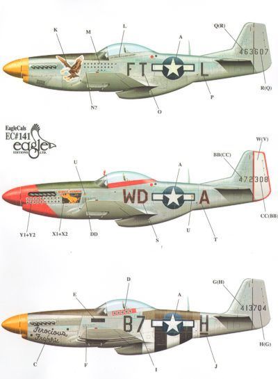 Eagle Cal - 1/72 North-American P-51D Mustang Part 3 (3) 44-63607 FT-L 354th Fg Lt.Col.Glenn T. Eagleston yellow nose, 44-72308 WD-A 4th Fg Maj Peirce W.McKinnon 'Ridge Runner III' red nose, 44-13704 B7-H 361st Fg Maj. Wallace Hopkins 'Ferocious Frankie' yellow nose