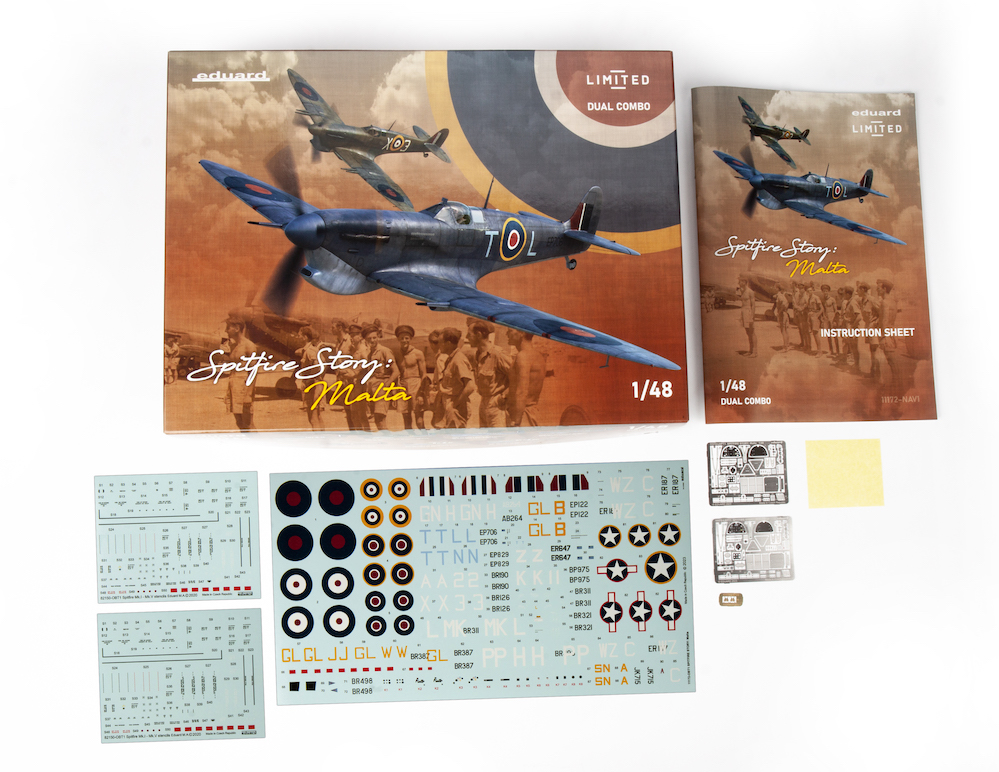Eduard - 1/48 Supermarine Spitfire STORY: Malta Dual Combo Limited edition kit of British WWII fighter aircraft Supermarine Spitfire Mk.Vb and Vc in 1/48 scale. From the kit you can build Supermarine Spitfire s fighting in the defence of the island Malta. plastic parts:Eduard marking options: 12 decals: Eduard Pe parts, Mask
