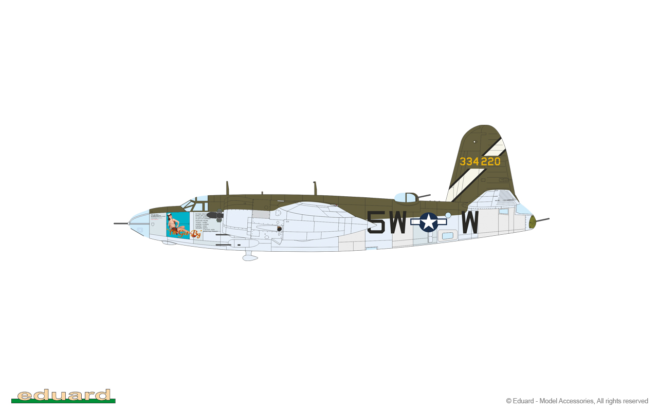 Eduard - 1/72 Martin Marauder Limited edition kit of WWII US medium bomber aircraft B-26F/G in 1/72 scale. In the box are machines from the MTO, Eto and PTO. plastic parts: Hasegawa- marking options: 8- decals: Eduard- Pe parts: yes, pre-painted- painting mask: yes resin parts: yes, wheels