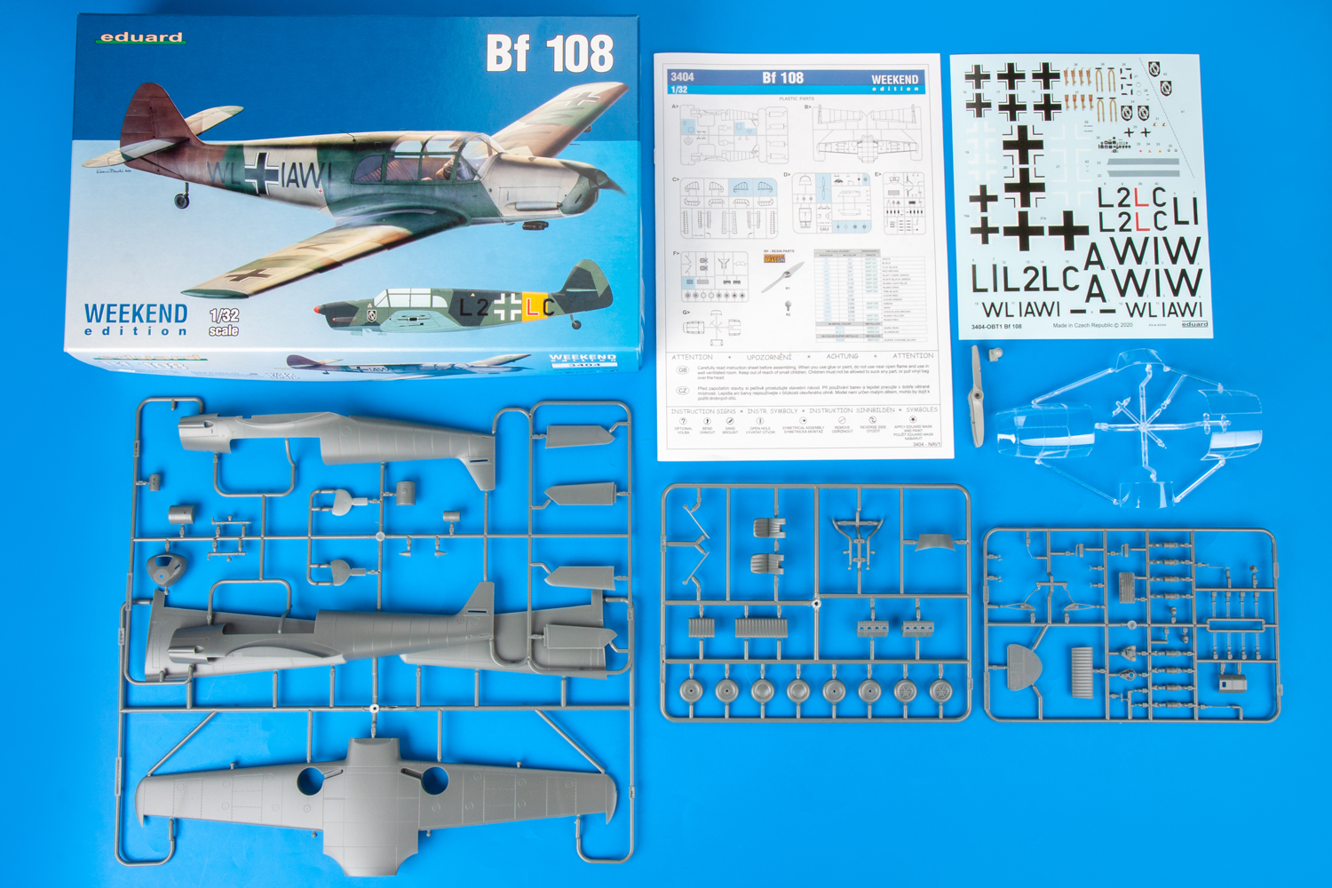 Eduard - 1/32 Messerschmitt Bf-108 Weekend edition kit of German WWII liasion aircraft Bf 108 in 1/32 scale. plastic parts: Eduard marking options: 2 decals: Eduard, Pe parts: no, painting mask:no