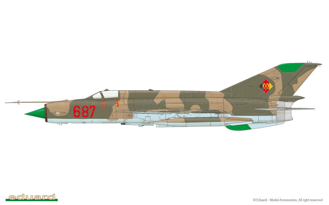 Eduard - 1/48 Mikoyan MiG-21MF ProfiPACK edition kit of Soviet Cold War jet fighter plane MiG-21MF in 1/48 scale. Plastic parts: Eduard, marking options: 6, decals: Eduard, Pe parts: yes, pre-painted, painting mask: yes, resin parts: no