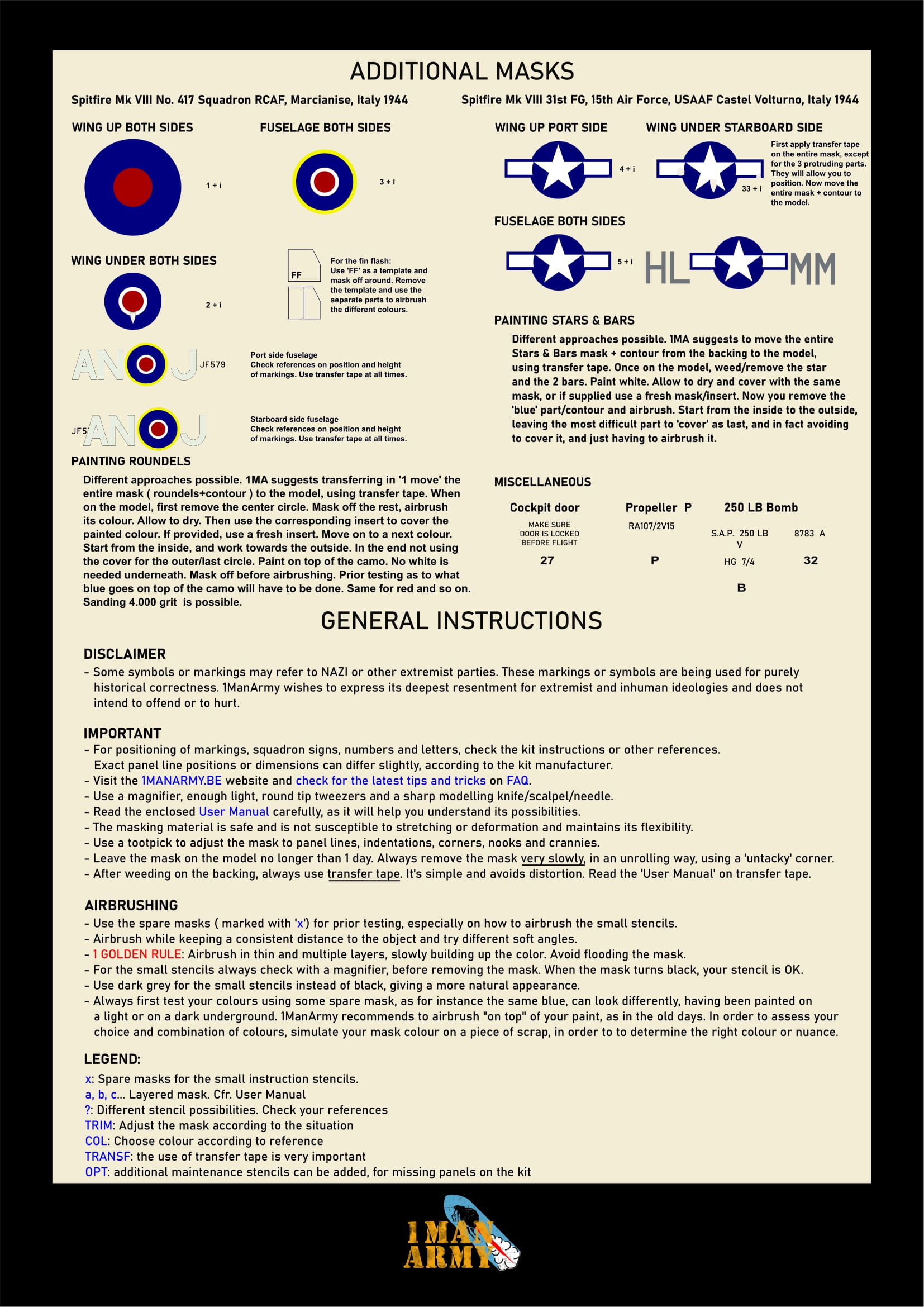 1ManArmy - 1/32 Supermarine Spitfire Mk.VIII contains high definition stencilling and basic national insignia paint masks for Tamiya