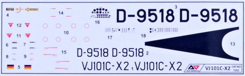 A & A Models - 1/72 VJ101C-X2 SUPERSONIC-CAPABLE VTOL FIGHTER. Brief history: In 1959 the design teams of the German companies Bolkow, Heinkel and Messerschmitt were formed into a consortium named Entwicklungsring Sud to develop a Mach 2 VTOL interceptor for the Federal German defence ministry. Heinkel left the consortium in 1964 and in the following year it was re-formed as a company with the title Entwicklungsring Sud GmbH, known more usually as EWR.Two prototypes of the EWR VJ 101C single-seat experimental VTOL aircraft were built. Generally similar, they were both of high-wing monoplane configuration, primarily of light alloy construction, had retractable tricycle landing gear and accommodated the pilot in a pressurised cockpit, seated on a Martin-Baker ejection seat. Powerplant comprised six RB.145 turbojets, developed jointly by Rolls-Royce and MAN-Turbomotoren, with two mounted vertically in the fuselage, immediately aft of the cockpit, and two in a swivelling pod at each wingtip.