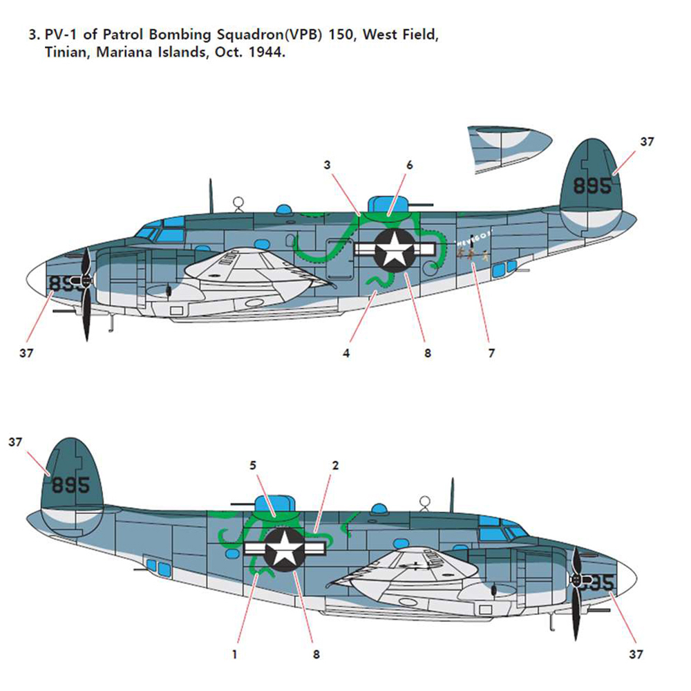 Choice of 6 markings: 1 PV-1 'Scooters Dream', unknown unit, Russell Islands, Solomon, mid-1943, 2 PV-1 'Blonde Blitz', unknown unit, Russell Islands, Solomon, mid-1943, 3 PV-1 Patrol Bombing Squadron VPB 150, West Field, Tinian, Mariana Islands, Oct 1944, 4 B-34 'Lexington' built for Raf but used by Usaaf for coastal patrols/training missions, 5 RB-34 'Lexington' USAAF, Randolph Field, TX, 1942 'R' = 'Restricted from combat use', 6 B-34, Col Michael Alexandrovich Eryomin, 128th Air Division, 'Za Pobedu' For Victory.