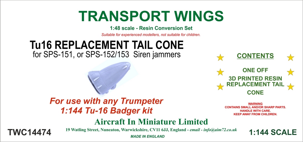 AIM - 1/144 TU-16 Replacement Tail Cone for SPS-151/152/153 Siren Jammers. (for any Trumpeter 1/144 Tu-16 Badger kits)