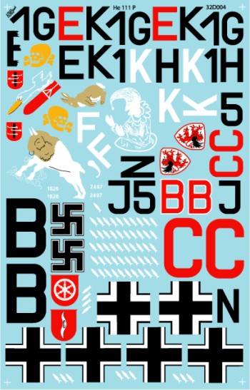 Aims - 1/32 Heinkel He-111P 5 1G+EK of 1/KG 27 Boelcke Poland 1939; G1+KH 1/KG 55 with White Buffalo on fuselage; 5J+CN of 5/KG 4 shot down by Skuas over Norway 1940; White F 8/KG 76 with mission marks along fuselage; B3+BK 3/KG 54 with Rabbit and Bomb carry Raven on fin.