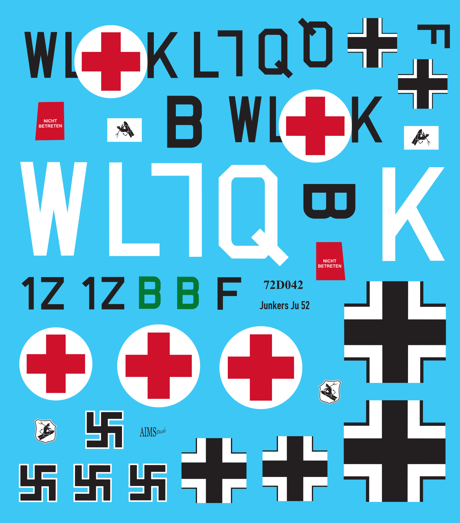 Aims - 1/72 Junkers Ju-52/3m WL+KLQ Sanitatas Flugber.z.b.V Poland late 1939, 1Z+BF IV./KG.z.b.V.1 Balkans May 1941, perviously available on the long out of print AIMS72D011