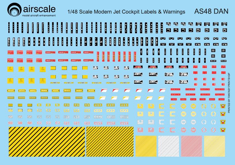 Airscale - 1/48 Modern Cockpit Data and Warning decals. A full-colour cockpit set that covers the many labels found on modern cockpit side consoles and includes a full range of warning placards as found on European and US Ejector seats and hazard markings found throughout the cockpit. Includes both pre-shaped and blank hazard stripe panels that can be cut to size