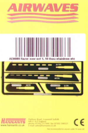 Airwaves - Razor saw Set No.1. 10 thous stainless steel razor saw. 4 blades which can either be used free hand or will fit the Swann Morton no 3 handle.