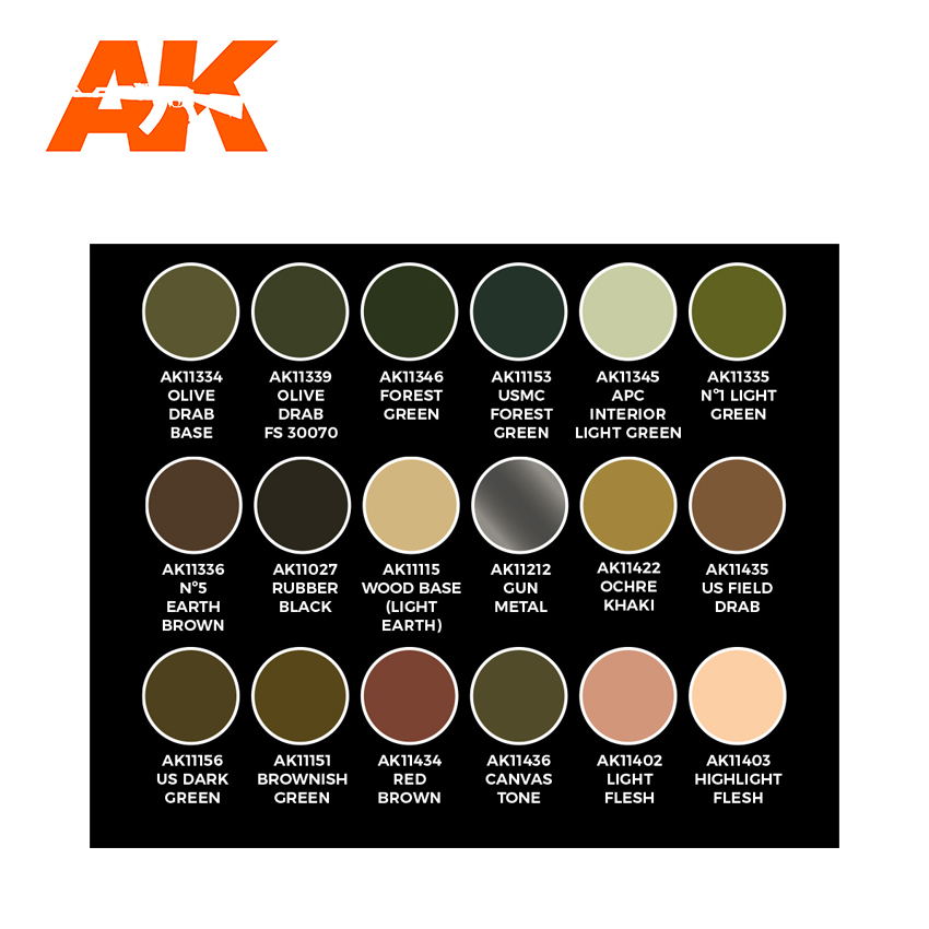 this signature set from ak interactive includes a selection of 18 colors considered by adam essential for painting a wide variety of wwii and modern military vehicles using the best acrylic paint on the market. His selection includes colors for painting the base coats, tools, and running gear along with the crew.