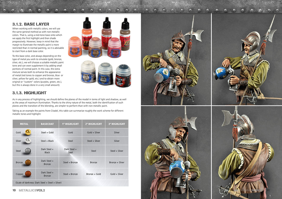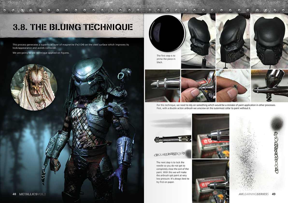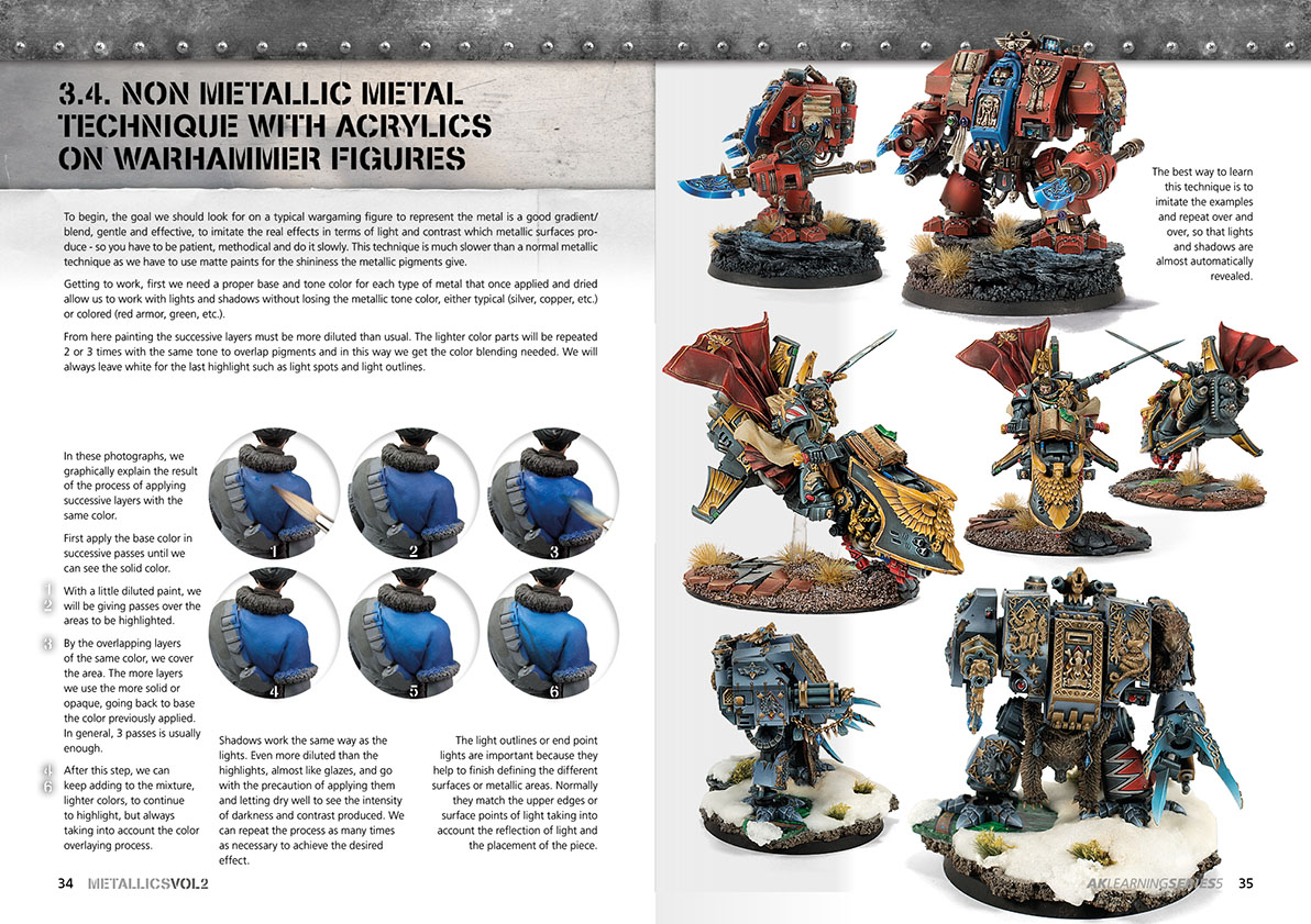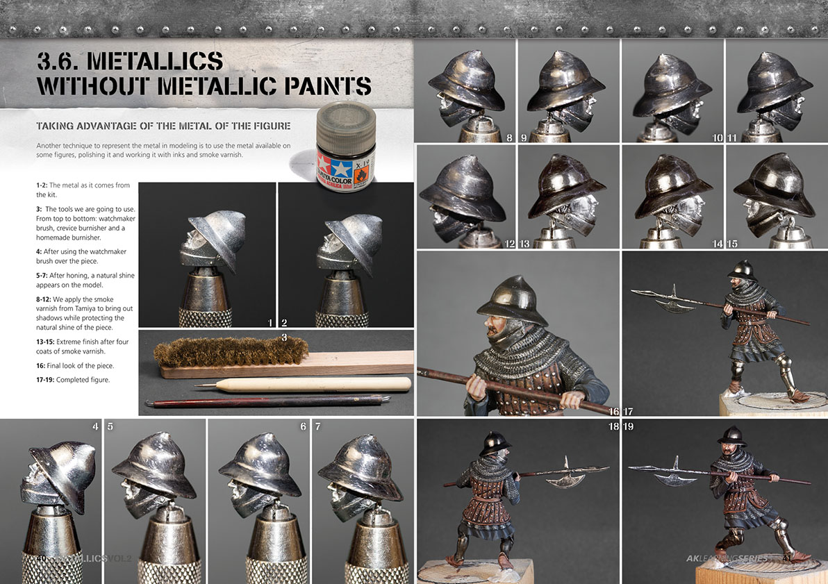 AK Interactive - Metallics vol. 2 learning series 5 metallics have always been a difficult task for modellers. It doesn't matter which modelling branch you choose, at some point you will find yourself in front of a metal piece/part which, of course, you want to finish as realistic as possible. There exist many ways to achieve a metal finish, from the use of enamels, towards waxes and bare metal sheets. Inside these two volumes dedicated to metallics, the talented artists from the ak learning series take you on a journey through the difficult tasks of mastering metallics. In this second volume we will show how to apply metallic effects over historic and fantasy figures. How to paint metallics without metallic paints using the "non metallic metal" technique, to use properly lights and shadows to imitate metallic effects, polished metals, bluing technique etc. Many tricks and techniques from the best modelers. We will see examples applied to robots, spaceships, historic figures, and many more