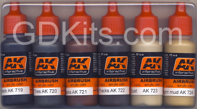 AK Interactive - Track And Wheels Set - The six new colors are specifically designed to creat a realistic appearance for all types of wheels and tracks. The set includes a Darker Black color with a satin finish to represent new tires, while the wear of older tires is represented by a Dark Grey color. Also included are two new shades of track colors; a Light Rust color to represent fresh rust as might be observed on the tracks of an abandoned AFV, and a Dark Tracks that accurately creates the appearance of operational treads. Finally, two tones Dry Mud and Light Dust, which will allow you to dirty and dust your wheels and tracks easily for a natural appearance.