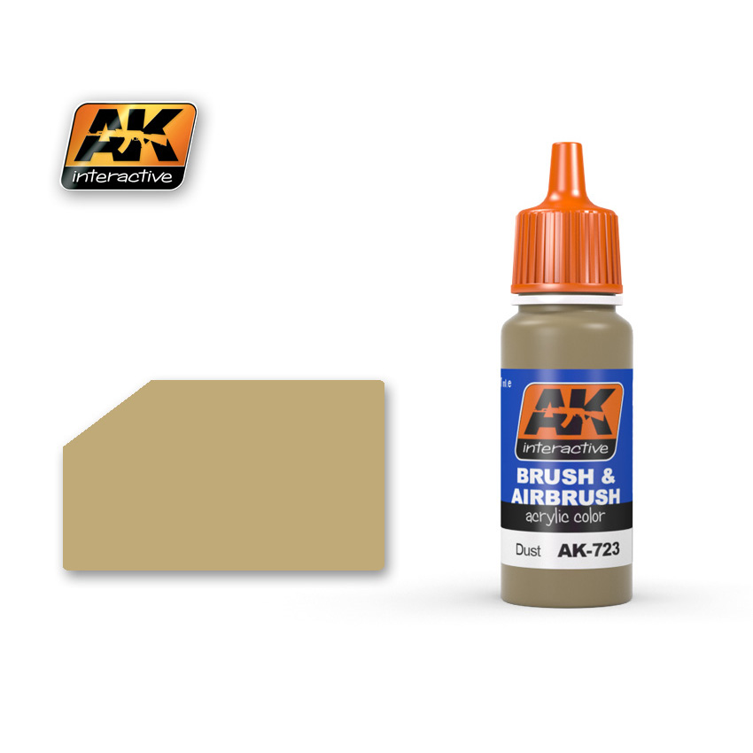 AK Interactive - DUST Apply irregular layer of Dust with Brush or Airbrush.Apply to rubber tires and tracks as a dust wash by diluting with water.Use with AK-724 Dry Light Mud for a more realistic effect on lower hull and wheel well areas affected by movement over natural terrain.Use alone or mix with other acrylic paints to obtain a different color.Just shake it and use it directly in the airbrush or by brush.It can be easily thinned with the specific acrylic thinner or water if necessary.