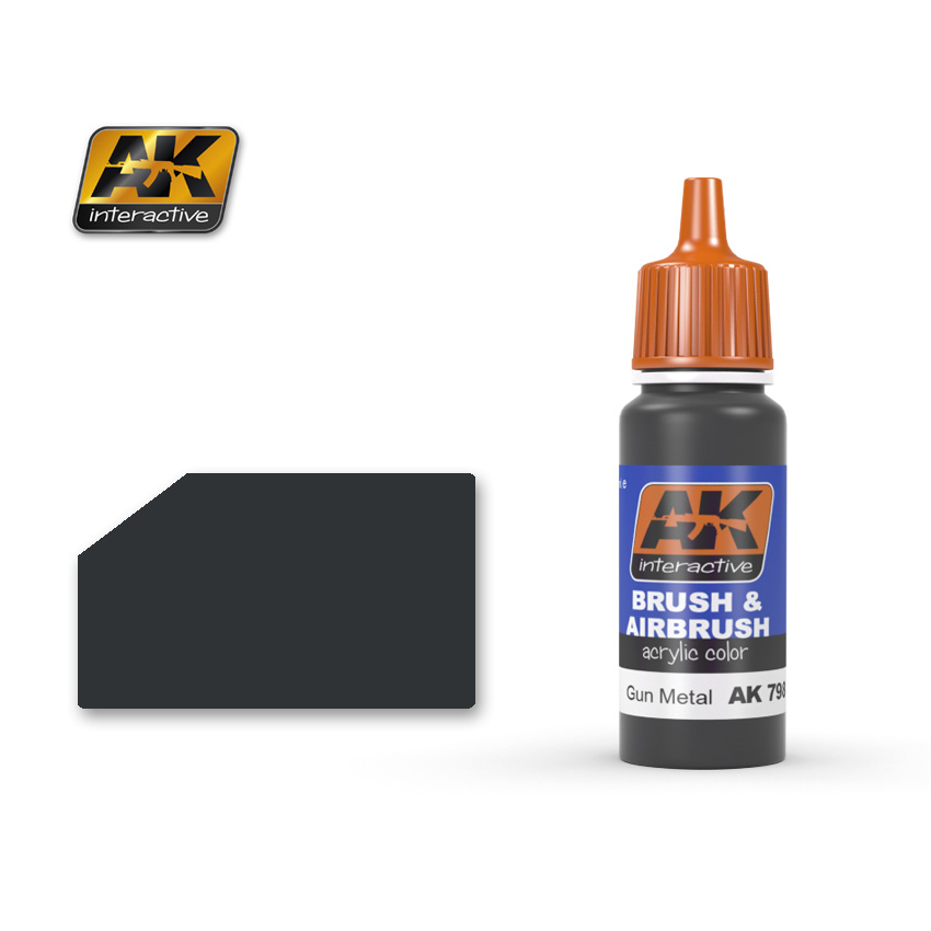 AK Interactive - GUN METAL 17 mL acrylic paint. Use alone or mix with other acrylic paints to obtain a different color. Just shake it and use it. The paint is designed to be effective for airbrush and brush and is water- soluble, avoiding strong smells and harmful solvents. It can be easily thinned with the specific acrylic thinner or water if necessary. The acrylics are manufactured by AK Interactive and are made with a formula that prevents clogging in the airbrush.