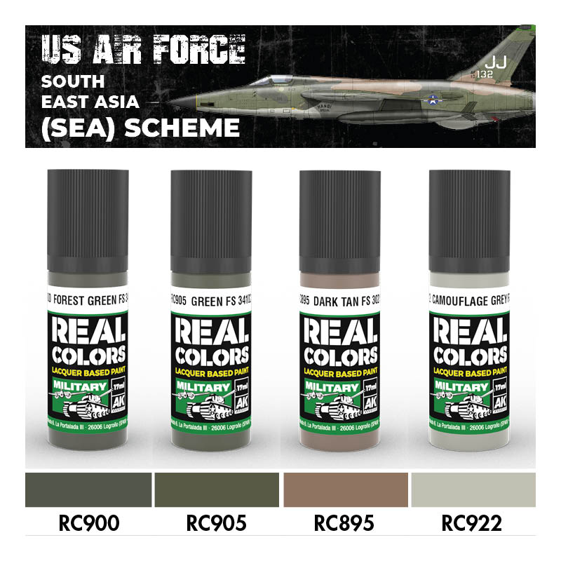 selection of four camouflage colors that are essential for painting models of aircraft used in the southeast asia theatre of operations in the 1960s-1970s by the units subordinated to the usaf tac (tactical air command), including such types as the a-1 skyraider, a-7 corsair ii, a-37 dragonfly, b-57 canberra, f-4 phantom ii, f-100 super sabre, f-102 delta dagger, f-104 starfighter, f-105 thunderchief, f-111 aardvark, rf-101 voodoo and others.