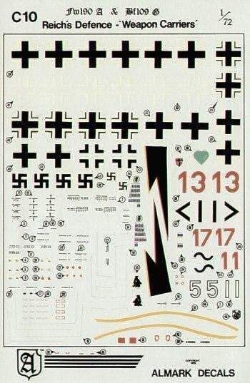 Almark - 1/72 Reichs Defence. Focke-Wulf Fw-190A, Messerschmitt Bf-109G 111/JG 11; 2/JG 11; IVSturm/JG 3; 8/JG 54AKC11 Messerschmitt Bf-109E-1/Bf-109E-3/Bf-109E-5. 9/JG 26; 7/JG 53; 6/JG 52; 2/JG 3; 3/JG 2