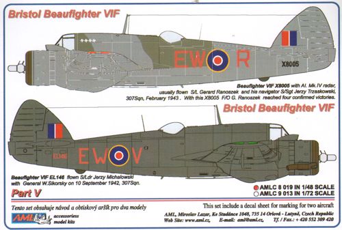AML - 1/48 Bristol Beaufighter Mk.VIF X8005 (EW-R),- Polish Squadron with AI. Mk.IV radar, usually flown Gerard Ranoszek and his navigator S/Sgt Jerzy Trzaskowsi, 307Sqn, February 1943. With this X8005 F/O Ranoszek reached four conformed victories Beaufighter Mk.VIF EL146(EW-V), Polish Squadron with AI. Mk.IV radar, flown S/ldr Jerzy Michalowski with General W.Sikorski on 10September 1942, 307Sqn (for Tamiya kits)