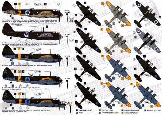AML - 1/48 Bristol Blenheims over Finland (6) Mk.I (5) BL-111, BL-117, BL-189 2 versions, BL-189. Mk.IV BL-201. All in variations of dark green/black camouflage schemes with yellow fuselage bands and wing tips