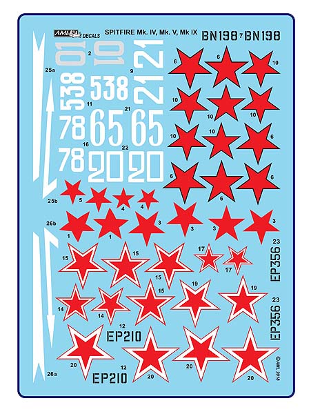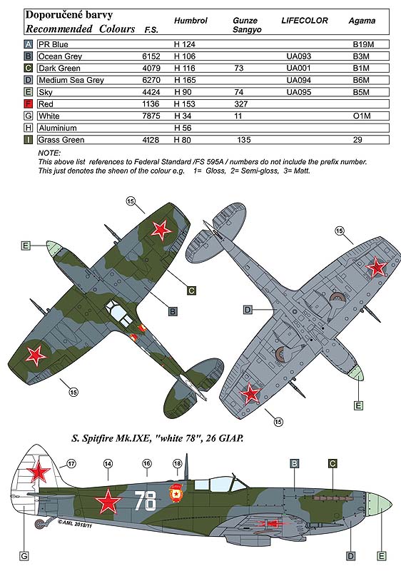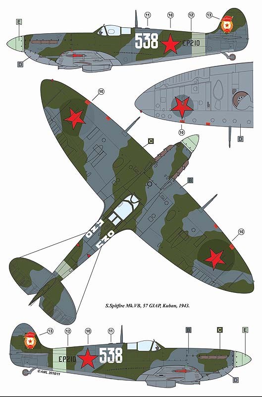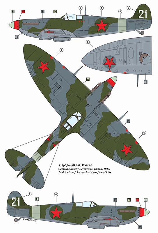 AML - 1/48 Supermarine Spitfire Mk.VB/PR Mk.IV Lend-Lease Supermarine Spitfire. Soviet Air Force (4) Mk.Vb Silver 01 modified to PR.IV tested at Research Institute Moscow 1942-3 overall PRU blue, BN198 White 21 57 GIAP Capt A.Levchenko, EP210 White 538 57 GIAP, Mk.IXe White 78 26 GIAP Leningrad 1944 white fin/rudder. All standard RAF camouflage. Inc photo-etched seat belts.