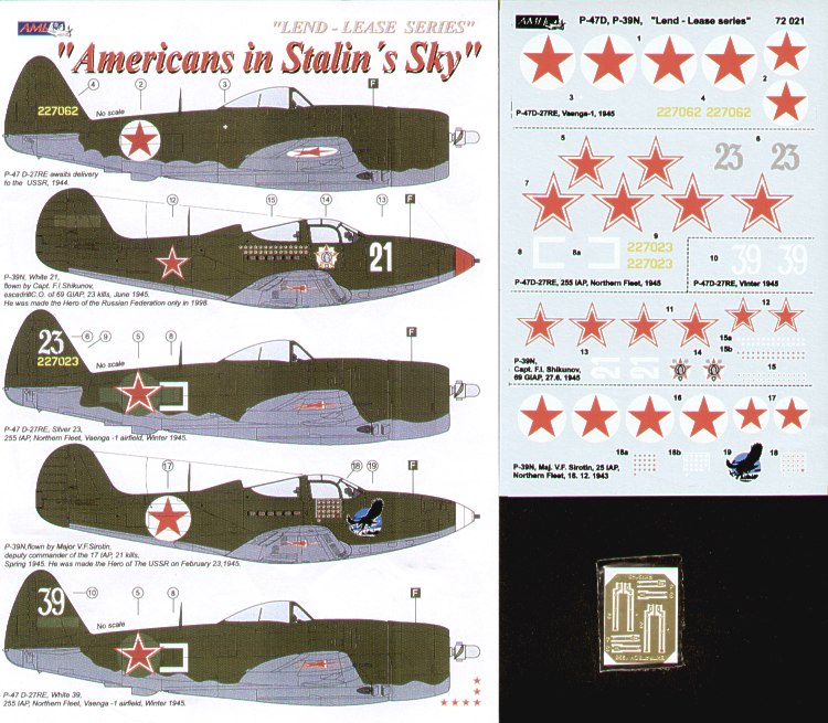 5 Bell P-39N Airacobra White 21 69 Giap Capt Shikunov 1945; Eagle nose art 17 Iap Major Sirolin; Republic P-47D Thunderbolt 'Bubbletop' 42-27062 delivery scheme; 42-27023 Silver 23; White 39. Both 255 Iap Northern Fleet Veenga winter 1945. Inc photo-etched seatbelts