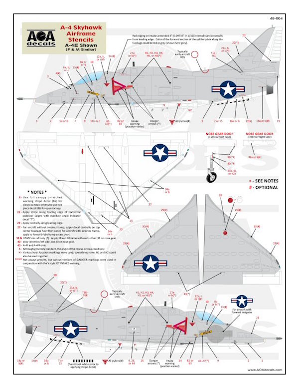 AOA Decals - 1/48 Douglas Skyhawk Airframe Stencils (Hi-Viz) - A-4A/A-4B/A-4C/A-4E/A-4F/A-4L/A-4M This sheet provides the A-4 Skyhawk airframe stencils for one aircraft in the high-visibility Navy light grey/white camouflage scheme. The Skyhawk's stenciling varied (even from aircraft to aircraft within same squadron and time period) - it would be near impossible to capture every style and variant. This sheet captures one of the most typical overall appearances for the smaller text based stencils, while also providing several of the more common variations, in some cases multiple options are provided of one marking. Multiple styles of various common markings provided: Two versions of intake warnings (covering both early & late A-4s) Three versions of ejection seat warnings Seven versions of the crew rescue arrows (with optional Japanese character addition) Three rescue panel options (including early style used when national insignia was applied on the forward fuselage) Six versions of the horizontal stabilizer angle markings Six versions of the fuselage hoist markings Also includes earlier "deformed" national insignia when applied over the inflight refueling probe line on the right forward fuselage And more....