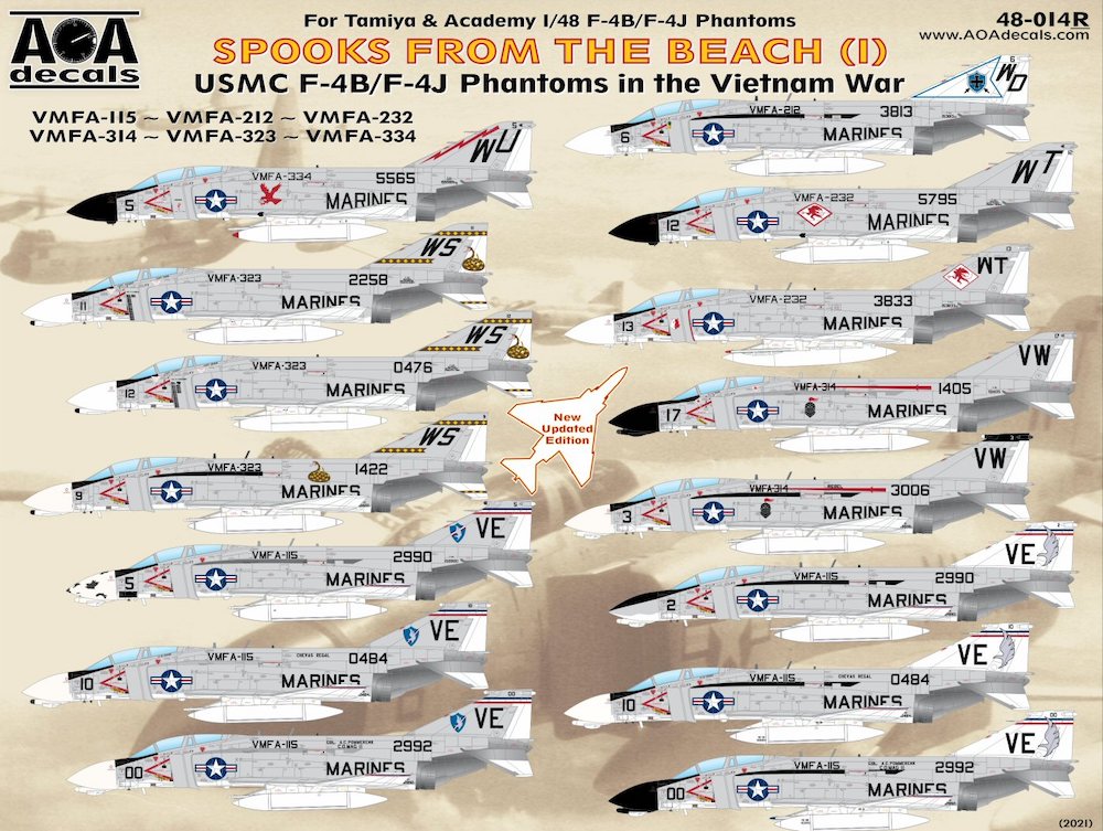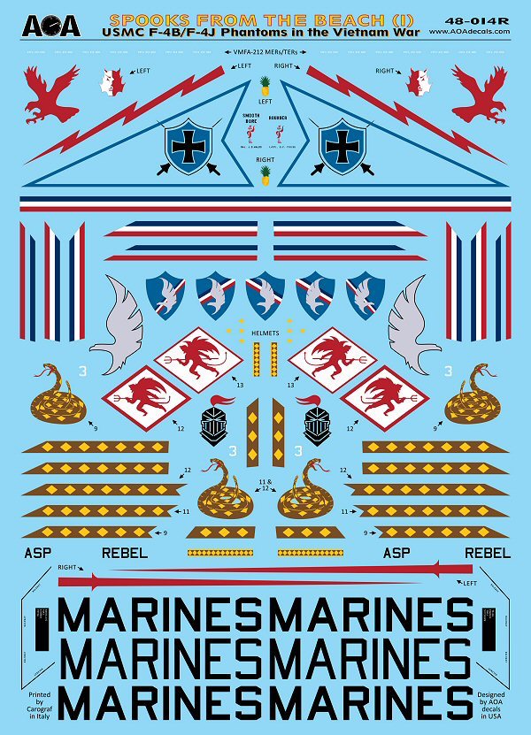 This extensive 1/48 sheet covers six Marine fighter attack squadrons operating the F-4B and F-4J Phantom in the Vietnam War (with some additional coverage when stationed in Japan and HawaII).