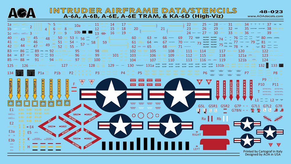 This 1/48 sheet provides the extensive A-6 Intruder airframe stencils and markings for one aircraft A-6A, A-6B, A-6E, A-6E TRAM, or KA-6D in the original high-visibility Navy light gull grey and white camouflage.