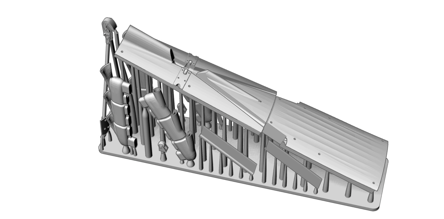 3D printed set with fuselage bottom, arrestor hook, exhausts (2 options), mirror, headrest, gun camera, oil collector ring, catapult spools and anti-glare exhaust shields.