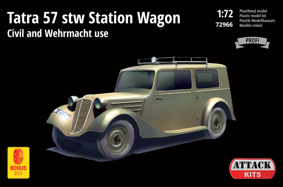 Attack - 1/72 Tatra T57 Stw Station Wagon Tatra 57 Stw Station Wagon Civil and WHThe kit contains a standard 'van' based on the Tatra 57A. The camouflage schemes include vehicles used by both civilian users and the Wehrmacht during WWII.Profi Line, incl. resin details, p/e parts