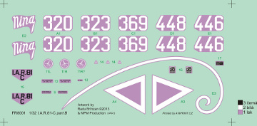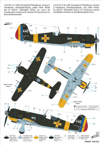 Frrom-Azur - 1/32 IAR-81C Rumanian fighter - 323 Mircea Dumitrescu, June 1944 - 323 Dumitru Baciu, January 1944 - 369 Nicolae Limburg, June 1944 - 448, April 1945 with roundel - 446, Gheorghe Grecu, July 1944 History: During the early 1930's the Rumanian Air Force adopted the Polish PZL P.11 and similar P.24, both being considered modern designs at the time. These PZL designs were produced under licence by Industria Aeronautica Romana (IAR). By the mid to late 1930's it was clear that war clouds were looming, and that both the P.11 and P.24 were already nearing obsolescence. In 1937 IAR undertook the design of more modern all-metal, low-wing design featuring retractable undercarriage, but retaining much of the P.24's rear fuselage structure. This was named the IAR-80, and was to be powered by a German Junkers Jumo engine. Never delivered, the Jumo was replaced by the IAR 14K-IIc32 fourteen-cylinder, double-row radial, delivering 870-hp. Maiden flight occurred on 4 th of April, 1939. The new fighter had performance approaching that of contemporary foreign designs like the Hurricane, P-36, Morane-Saulnier MS.406 and BF 109D. Various changes to weapons led to the IAR-80A, B and C sub-versions, and also the IAR-81C which was designed for fighter-bomber role during spring of 1941, although it served in both air interceptor and ground attack roles. The IAR-81C was the most numerous sub-version to be produced (from n° 300 to 450), deliveries starting early in 1943. Total production for IAR-80/81 series totalled around 450 units, but ceased after the American bombing of Brasov factory, on April 16th, 1944. Fifty IAR-80's were in service during the attack against Soviet Union, on June 22nd, 1941. 6th Group (61st and 62nd squadrons) and 8th Group (41st and 60th Squadrons) were engaged around Stalingrad front during the autumn of 1942. August 1st, 1943 saw IAR-80 & 81's defending the Ploiesti oil plants from attack by USAAF B-24 Liberators, during 'Operation Tidal Wave', when the Rumanian fighters downed some of the heavy bombers. On June 10th, 1944, IAR-81C's from 6th Fighter Group confronted P-38 Lightnings belonging to the USAAF 82nd and 1st FG (American pilots mistakenly reported having fought Fw 190's). Rumania joined the Allied powers in August 1944, and changed back the national insignia worn by its aircraft from crosses to traditional blue, yellow and red roundels. IAR-81C specifications: single engine low wing monoplane fighter with retractable landing gear. Engine: one IAR K14, 14 cylinder double-row air-cooled radial delivering 870-hp. Wingspan: 11,00m, length: 8,97m, wing area: 16,50m2. Operational ceiling 10,000-m, maximum speed at 5,000-m: 485 kmh. Weapons: 2 x 7,92 mm FN-Browning machine guns & 2 x M.G. 151/20 Mauser 20-mm cannons. Two droppable fuel-tanks could be carried on racks under the wings in place of bombs, plus a 250 kg bomb on a central fuselage rack (Although fitted during manufacture, the fuselage bomb rack seems to usually have been removed after delivery to units). Some references: Rumanian Air Force, the prime decade, 1938-1947, Denes Bernad, Squadron/Signal Publications IAR 80, Dan Antoniu and Georges Cicos, Editions TMA (in french) Rumanian Aces of World War II, Denes Bernad, Osprey Publishing Rumanian Fighter Colours 1941 - 1945, Teodor Liviu Morosanu, Dan Alexandru Melinte, MMP books The I.A.R 80 & I.A.R. 81, Airframe, Systems & Equipment, Radu Brinzan, SAM Publications Note: all IAR 81-C from 300 to 450 were produced after introduction of the olive green topsides / light grey blue undersides. Profiles of such planes with standard dark brown and dark green camouflage on top, light blue undersides would have to be taken with care.