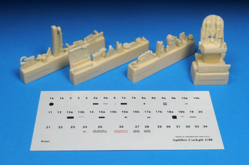 This set contains highly accurate and detailed replacement resin parts for the cockpit door, gunsight, stick, throttle and retract quadrants, seat with molded-in belts, and other detail parts. Also included is a sheet of cockpit stencil decals. It is designed to install quickly and easily in the Eduard Supermarine Spitfire Mk V series, but can be adapted to any other 48th scale Supermarine Spitfire V kit as well. Also suitable for Merlin powered Seafires. Master pattern by Roy Sutherland.