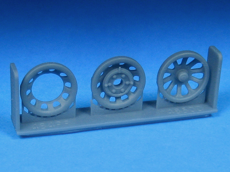 This set contains a pair of accurate 3D-Printed mainwheels with block tread tires, complete with period accurate logo and tire data. The hubs are printed separately to preserve the see-through effect of the real wheel hub. Two rear hub styles are supplied, allowing these wheels to be fitted to P-51 kits from different manufacturers. Applicable for all P-51 variants. Prototype through P-51K. A big detail upgrade from kit wheels.