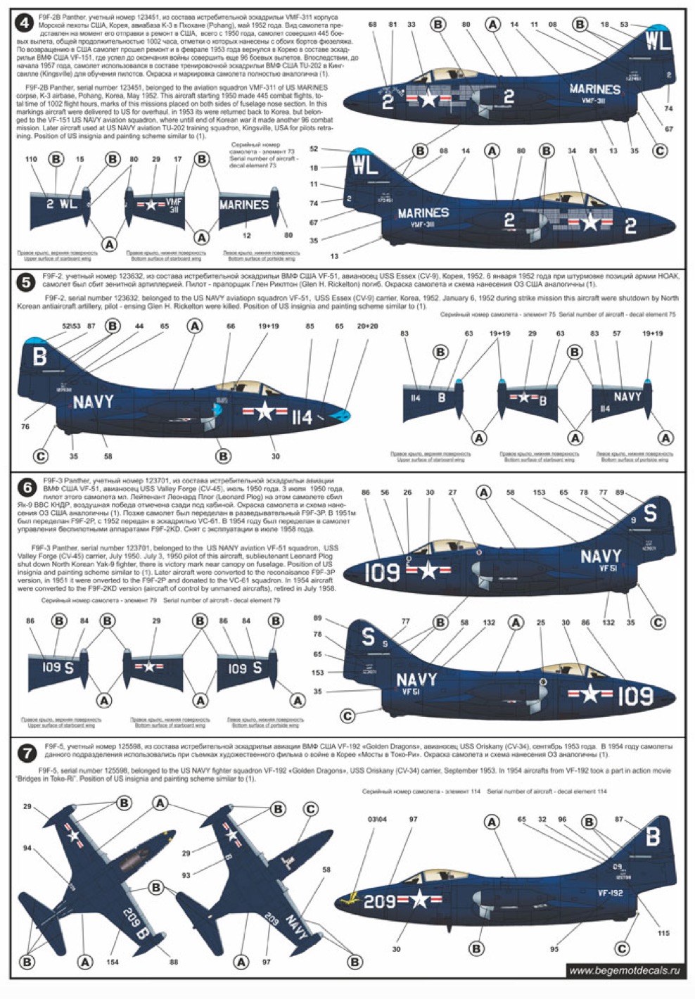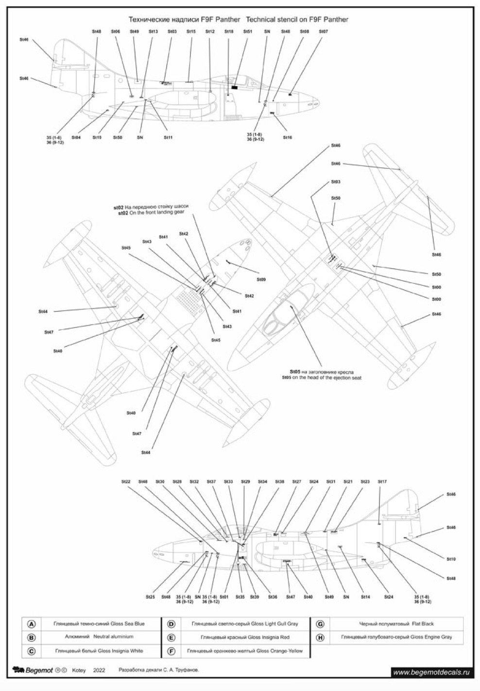 Begemot - 1/48 Grumman F9F Panther Decal with opportunity make 12 marking variations of F9F Panther from US Navy and Marines aviation and Argentinian naval aviation. In decal consist full stencil set for one aircraft.