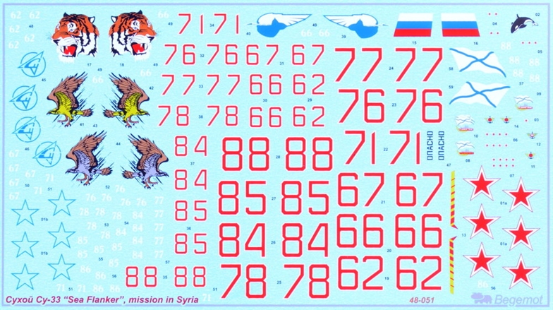 Begemot - 1/48 Sukhoi Su-33 from Soviet Naval Aviation in Syria. 10 markings scheme any Su-33s aircraft, which took a part in Admiral Kuznetsov carrier mission in Syria. Decal includes insignias, board numbers, badges and mission marks. This set Does Not include stencil for aircraft and external armament, please use BT4809 Su-27 family full stencil. Including one big size decals and two-pages instruction.