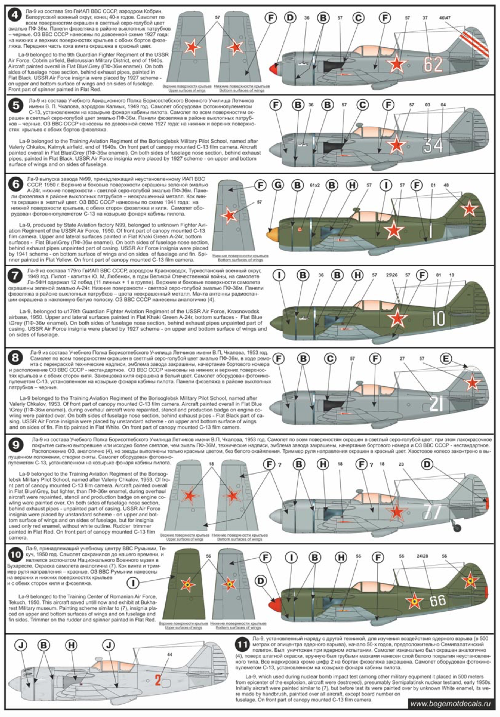 Begemot - 1/48 Lavochkin La-9/La-011 Decal with opportunity make 29 marking variations of La-9 and La-11 family aircraft's all types, from next AF's: USSR, China, North Korea, Romania and Indonesia. 4 sets of full stencil for La-9(11) aircraft included.