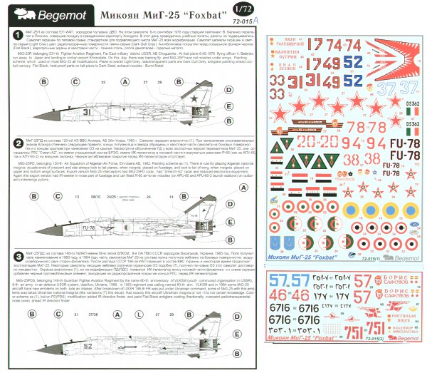 Begemot - 1/72 Mikoyan MiG-25P/MiG-25PD/MiG-25PDS/MiG-25PU/MiG-25RB/MiG-25RBF/MiG-25BM Foxbat (23) USSR, Algeria, Syria, Libya, Ukraine, Egypt, Bulgaria, Iraq, India, Natural Metal and Camouflage Schemes. Revised with 10 additional schemes
