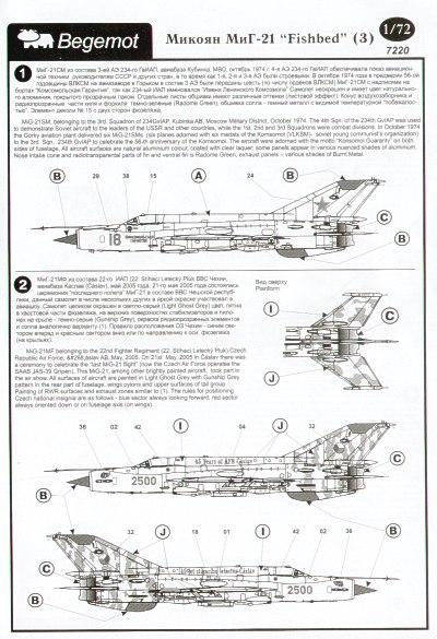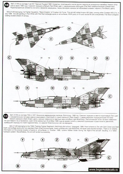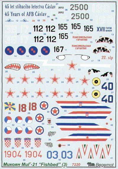 Begemot - 1/72 Mikoyan MiG-21 Late versions Part 3. (12) Red 18 234GvIAP Moscow 1974 `Konsomol Guaranty', Grey 2500 22nd Fighter Regt Czech Republic Air Force '25 Years of Air Force Base Caslav', White outline 17 18th Guards Air Force BaseR 1984, Black 112 352 Reconnaissance As Yugoslav Air Force 1991, White outline 38 263rd Aerial Reconnaissance Sqn Soviet Afghanistan 1983, 1sf Croatian Air Force, Blue 03 797 Training Regt Russia 1991, Red 1904 Hungarian Air Force 1993 shark mouth, Blue 40 234 Gbr Moscow, Black Knights Croatian Air Force overall red/white squares, White outline 160 706 Tfr 1986, Black Knights Croatian Air Force shark mouth 1998.