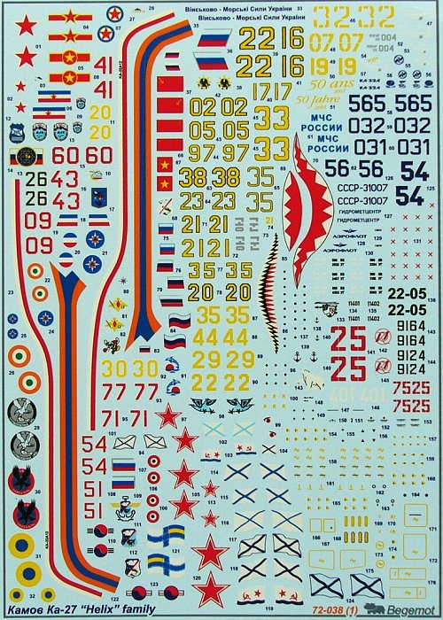 Begemot - 1/72 Kamov Ka-27 Helix family. Fantastic decal with markings for 62 different Ka-27, Ka-28 and Ka-29 in service with Russia, Soviet Navy, Ukraine, Indian Navy, Yugoslavia, China, Heliswiss Switzerland, Sth Korea etc., with stencil data and in a wide variety of camouflage schemes.
