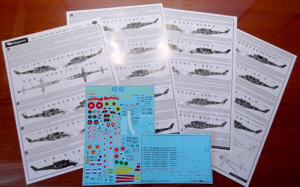 Begemot - 1/72 Mil Mi-24V/Mi-24VP/Mi-24R and Mi-24K. Decal includes 36 marking scheme for helicopters from different countries, also include full stencil set for one helicopter and any types of external armament.