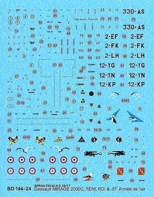 Berna Decals - 1/144 Dassault Mirage 2000C RDM : 330-AS, 2-EF, 2-LH, 2000C RDI : 12-YG, 12-YN, 12-KP, 2000-5F : 2-FK (7 schemes)