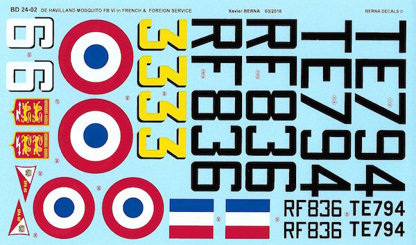 Berna Decals - 1/24 De Havilland Mosquito FB Mk VI in French Service : RF836 code 6 - GC I/6 'Corse' Rabat (Morocco) 1947-48, TE794 code 33 - GC 2/6 'Normandie-Niemen' Rabat 1947-48 (2 schemes)